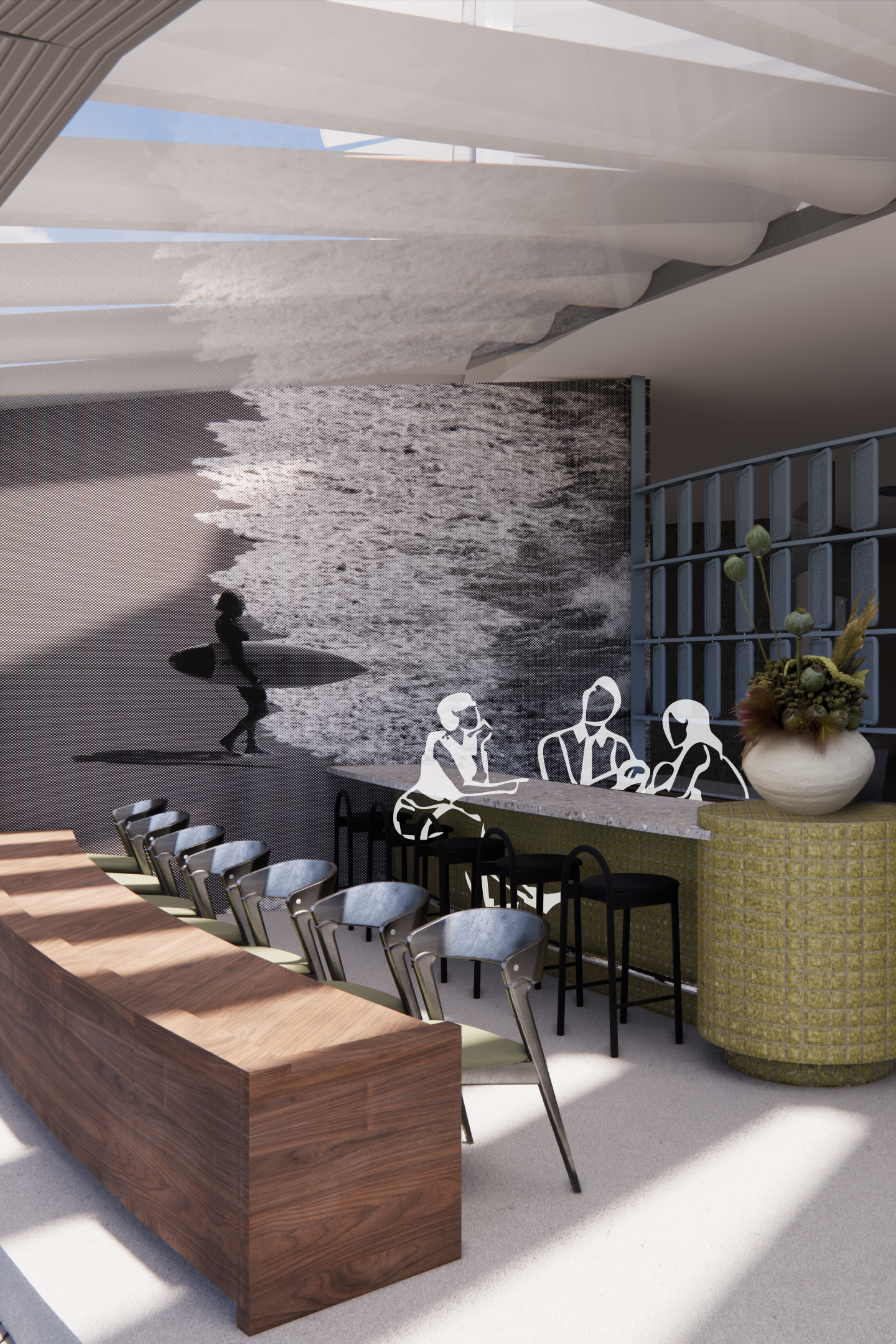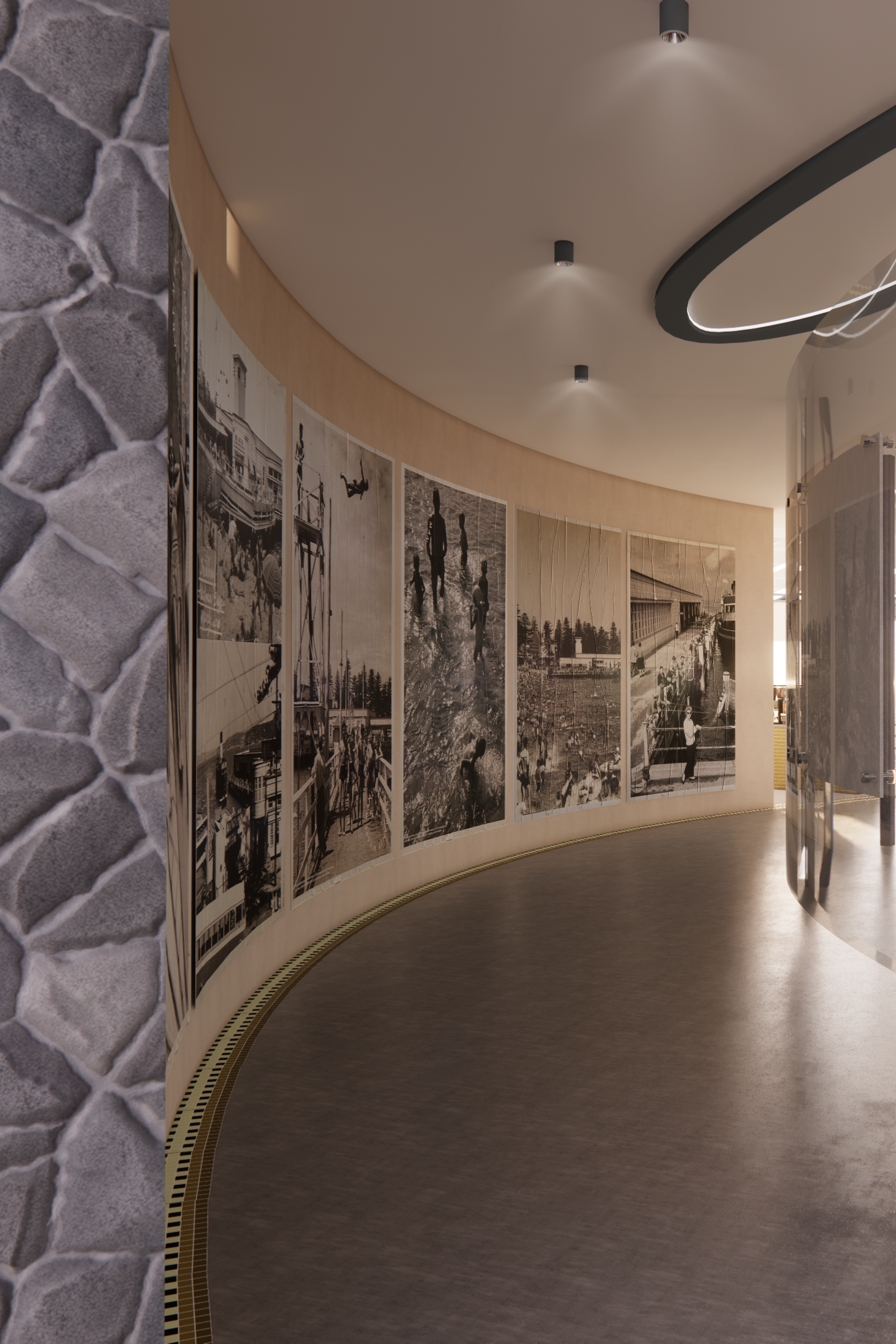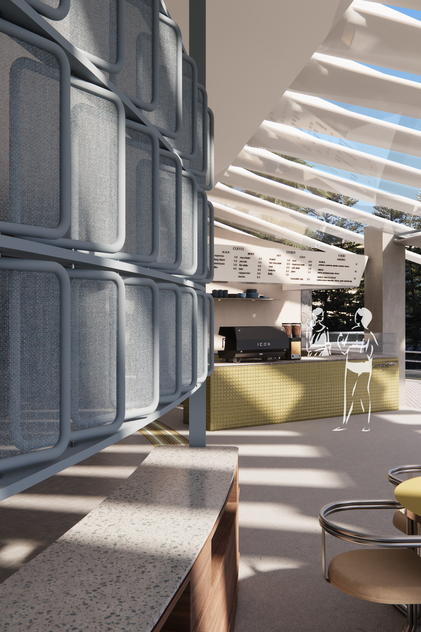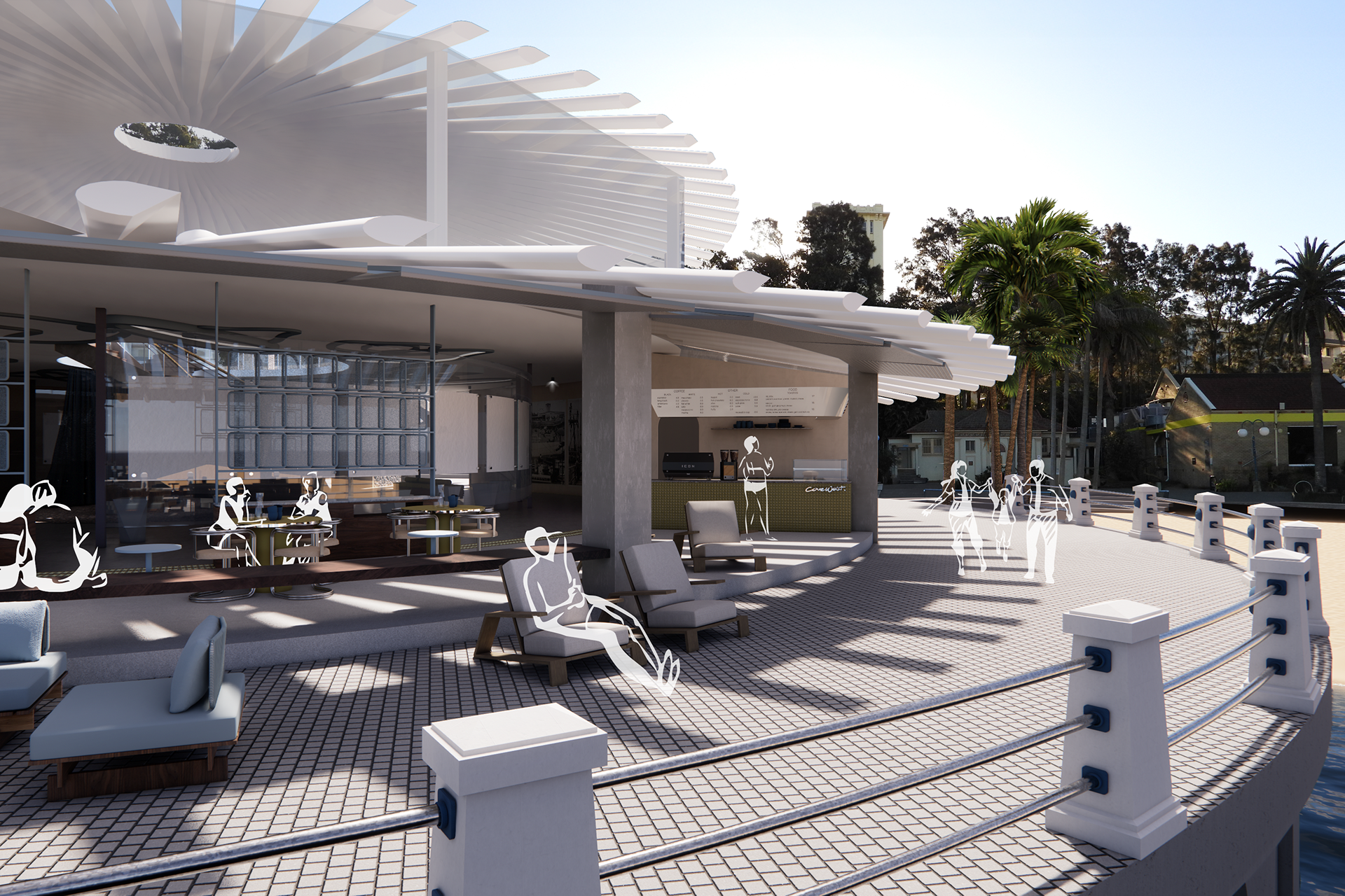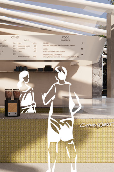Cove West is a mixed use community facility reviving the memory of the demolished Manly Aquarium. The space includes updated beach amenities, a cafe, a coastal education centre, and a hirable events area. Bringing back this piece of local heritage will grant its occupants a moment of reflection and reverence for their surroundings. The design creates a seamless transition between the indoor and outdoor, inviting the ocean into our space and echoing nearby coastal beauty. Transparency is used throughout the design to remain sympathetic to the surrounding heritage buildings. Cove West embraces and amplifies innovative and sustainable design through its raw textures, and focus on art and sculpture as a means of community-based education. Cove West celebrates people and culture, welcoming all generations to contribute to activating a vibrant and lively coastline.