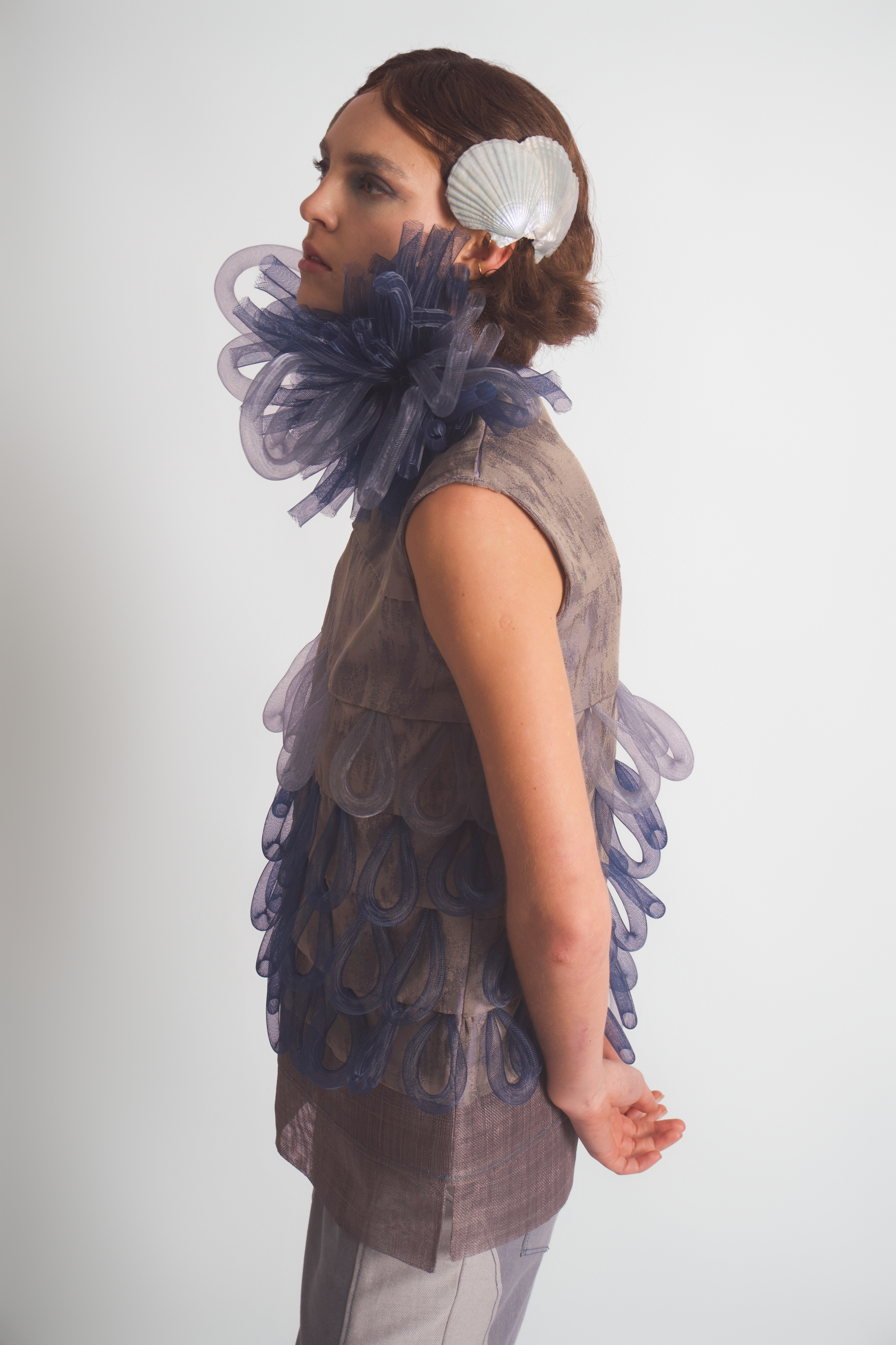 “Soft Shell Hard Coral” is inspired by the ethereal beauty and fluid movements of jellyfish and other oceanic life forms. This collection explores the tension between structure and softness — the delicate balance of danger and elegance beneath the sea. Undulating silhouettes, pleated textures, and asymmetric layers mimic the pulsating rhythm of marine creatures,