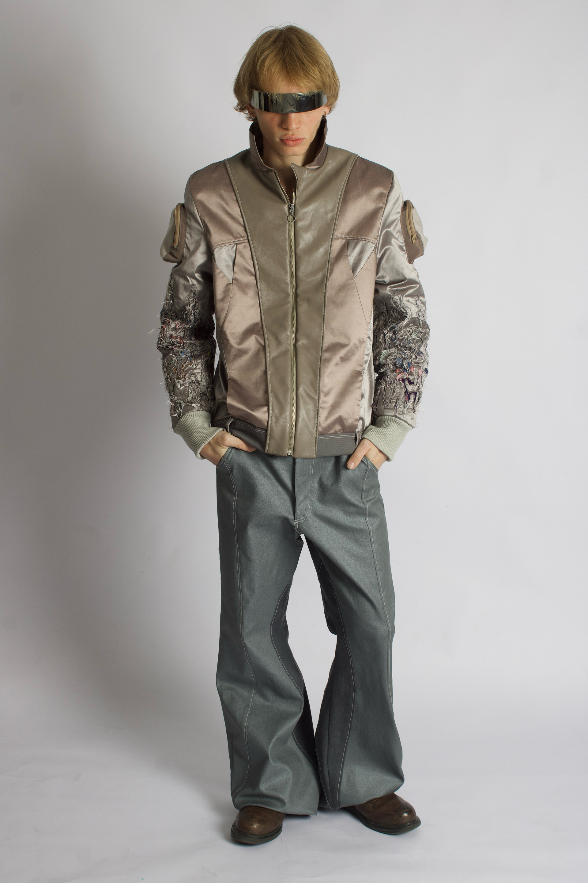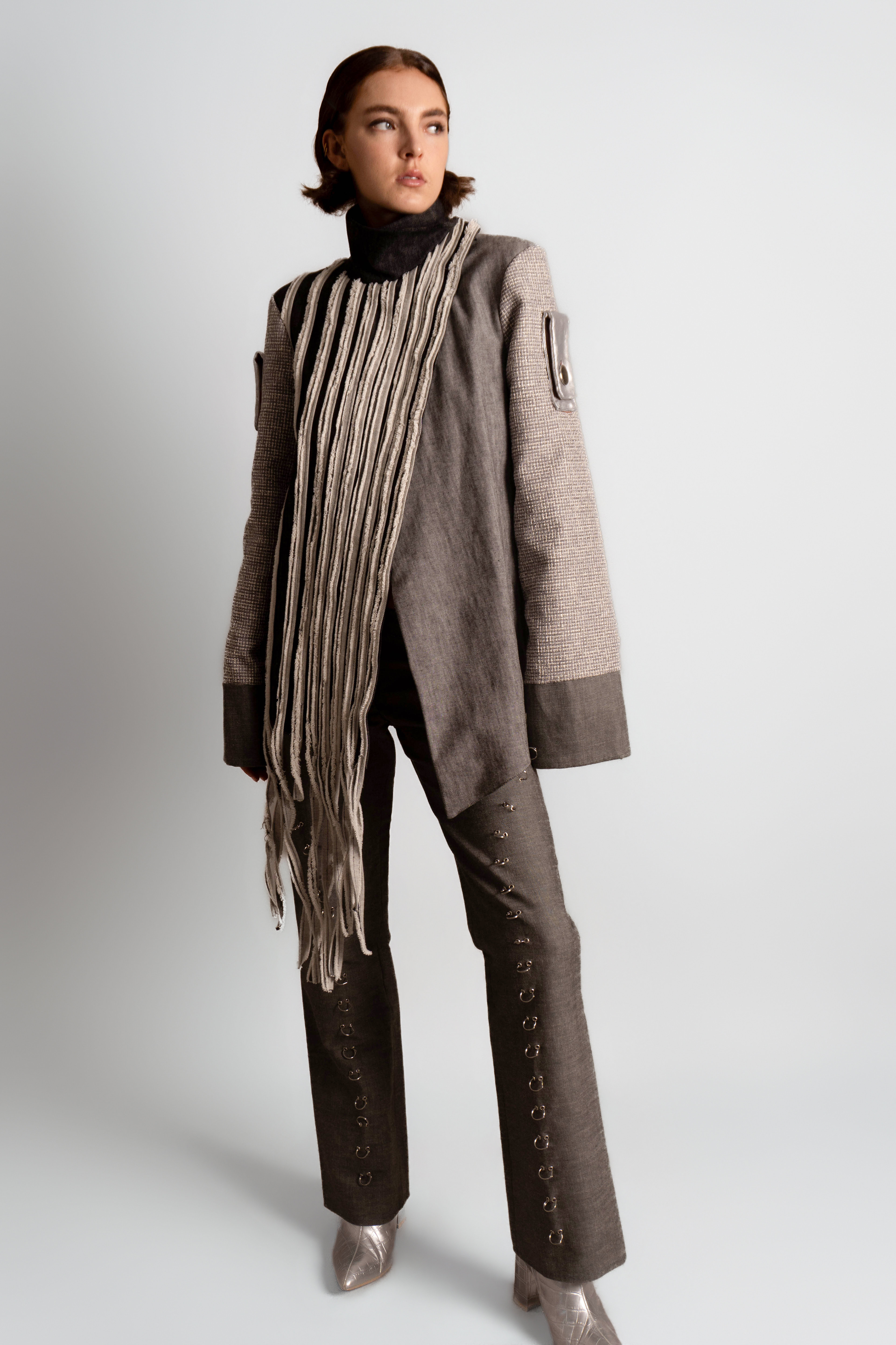while natural fabrics such as abaca sinamay and silk drill highlight a sustainable approach. This innovative project showcases an exploration of new possibilities by incorporating unconventional materials such as crinoline and sanamay. A palette of dusty lilac, muted grey, and mint-forest tones contrasts with structured textiles like checks and pinstripes, which suggests the collision between the organic and the synthetic. Annabelle’s collection includes both menswear and womenswear looks — a trans-seasonal capsule which is a testament to its versatility. This collection exists between fantasy and form, translating the underwater world into fabric, line, and motion.