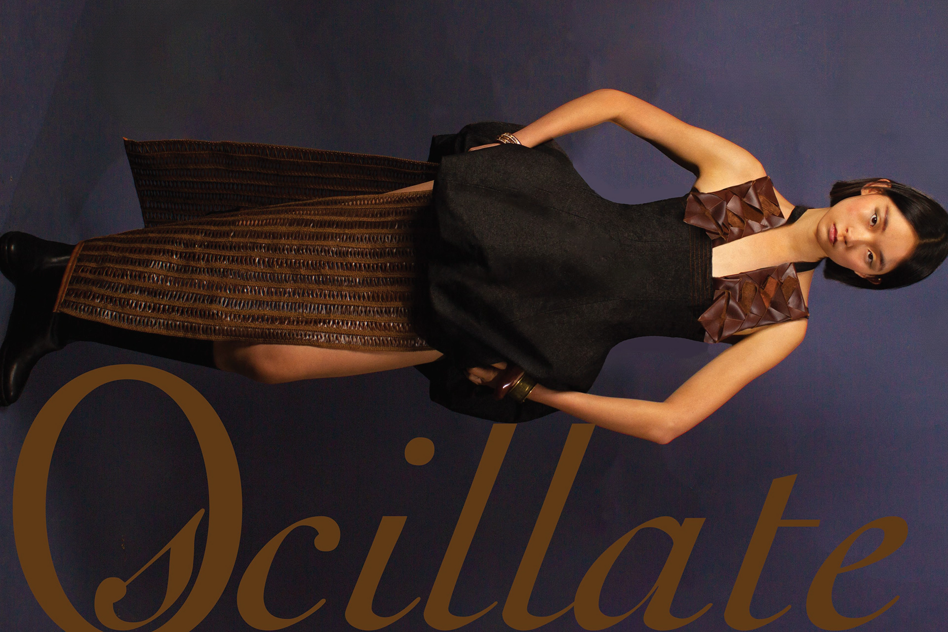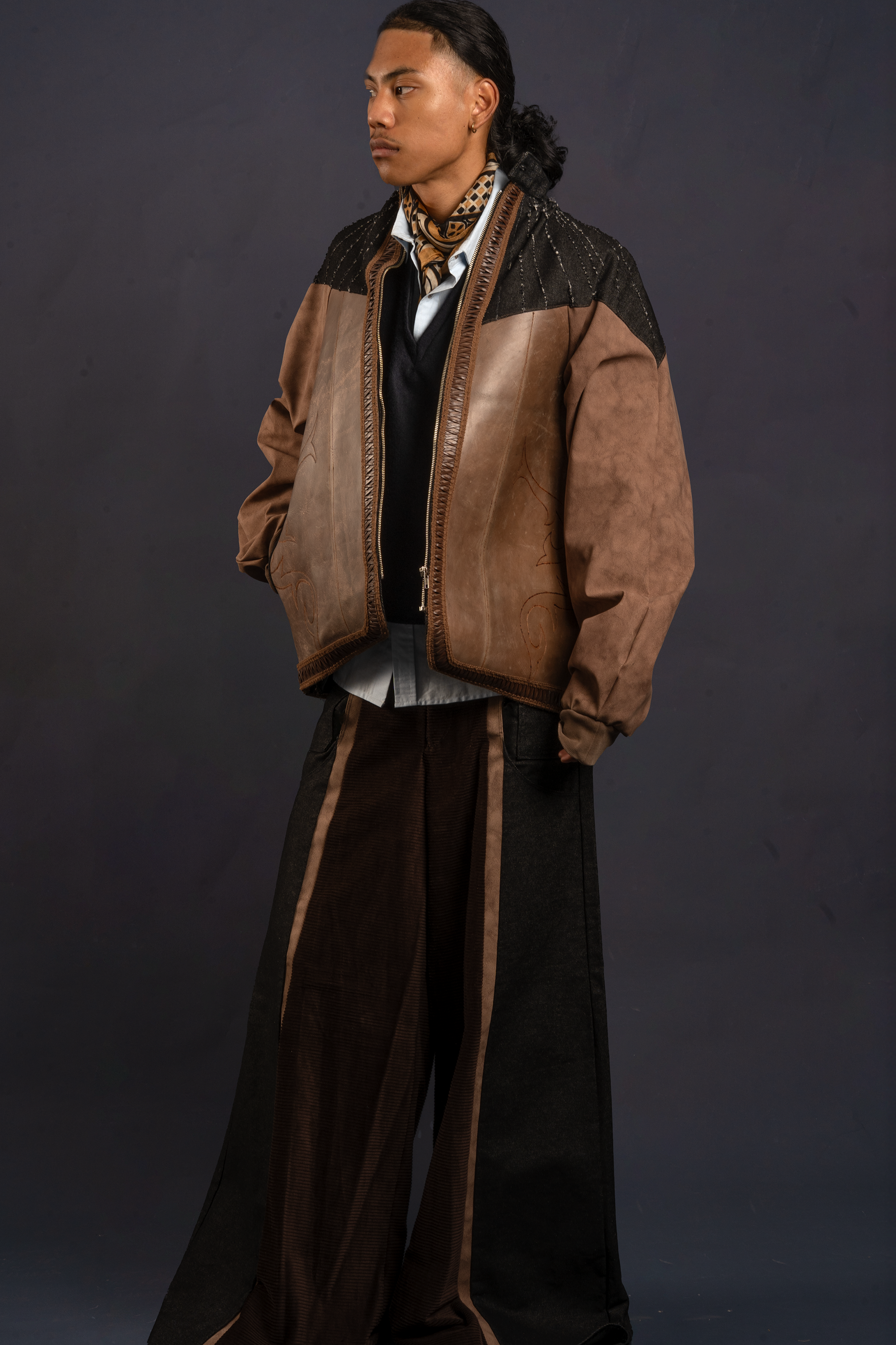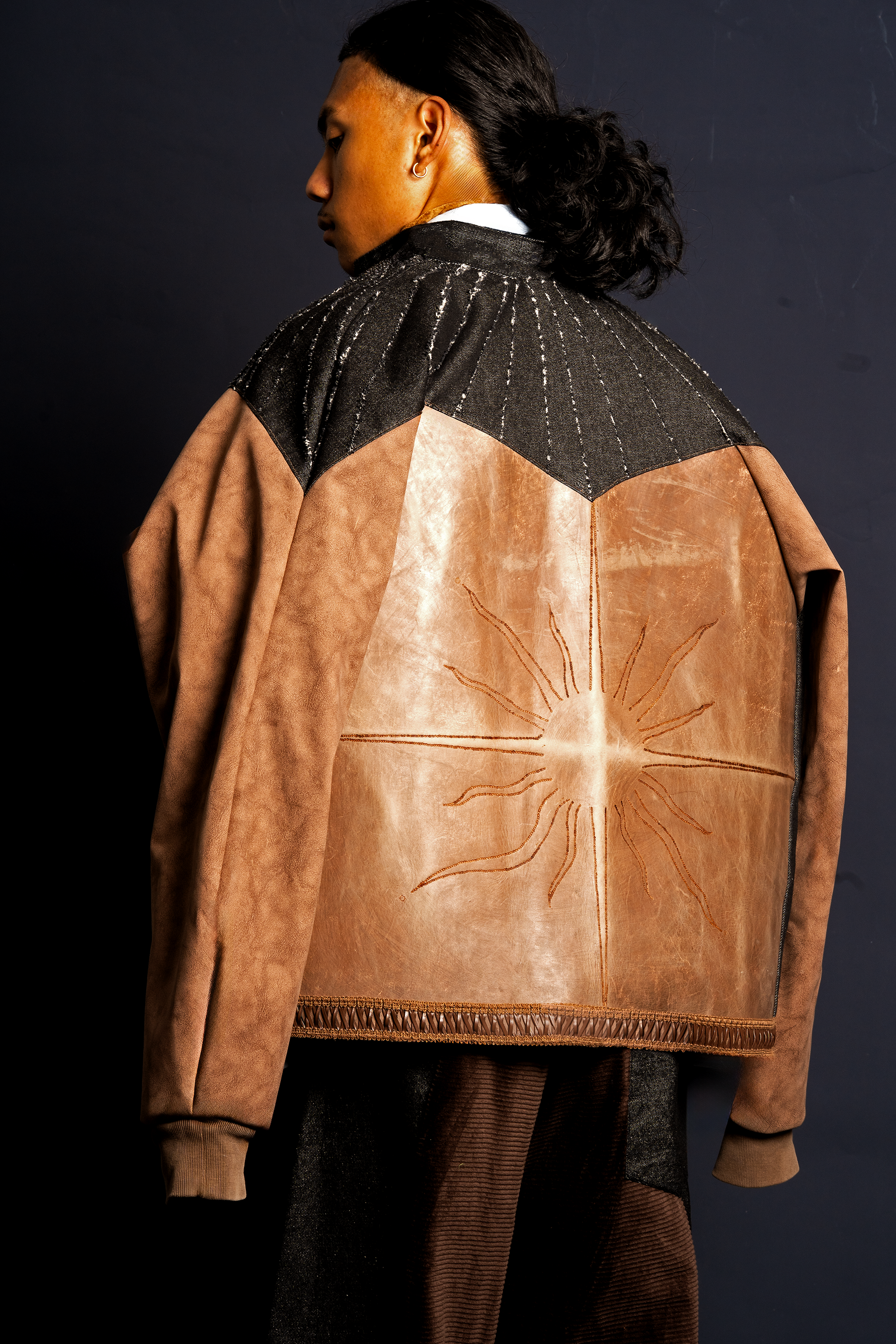 Oscillate is a collection that celebrates the movement of nature and the pull of nostalgia, inspired by a childhood spent in rural Tasmania. The designer uses texture and symbolism to craft a collection that is sleek and elegant, yet playful—inviting a closer look to uncover its thoughtful details. Influenced by vintage Western motifs, garlic and lantern flowers, artisanal leatherwork, and upcycling practices, each piece in Oscillate is designed to be treasured like an heirloom—something to keep, cherish, and pass down. Heirlooms and symbols hold the power to connect us to family and memory, especially when physical distance creates emotional space. Chloe’s collection reflects the complex feeling of nostalgia for a hometown you once longed to leave only to later find yourself drawn to the quiet charm and irreplaceable character of its people and places. Crafted from upcycled interior leather, denim, wool suiting, and corduroy, the garments are made to endure suited for both rural and urban landscapes. In a palette of rich browns, charcoal, and brass, Oscillate highlights texture and silhouette to create a visually striking, forward-thinking collection.