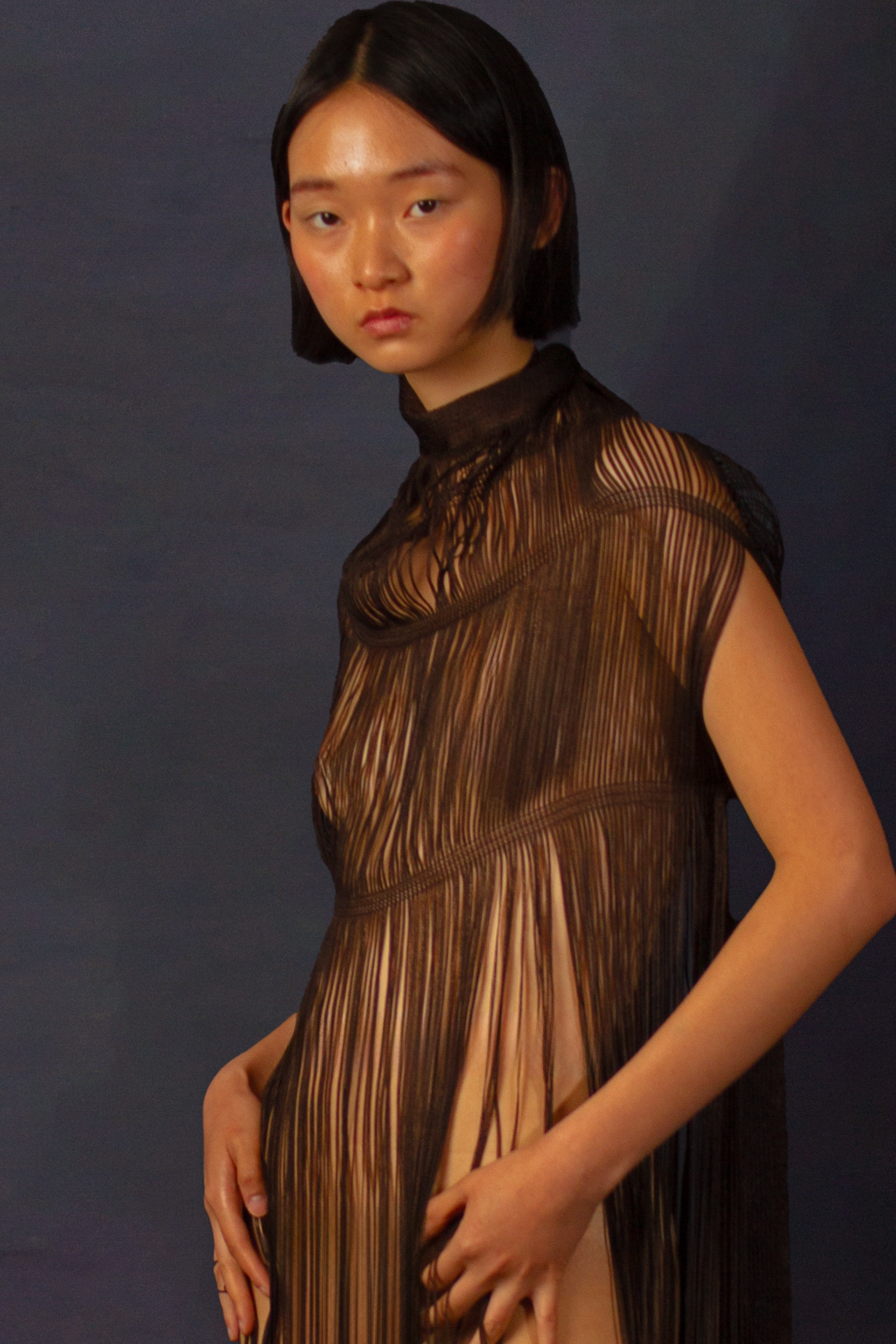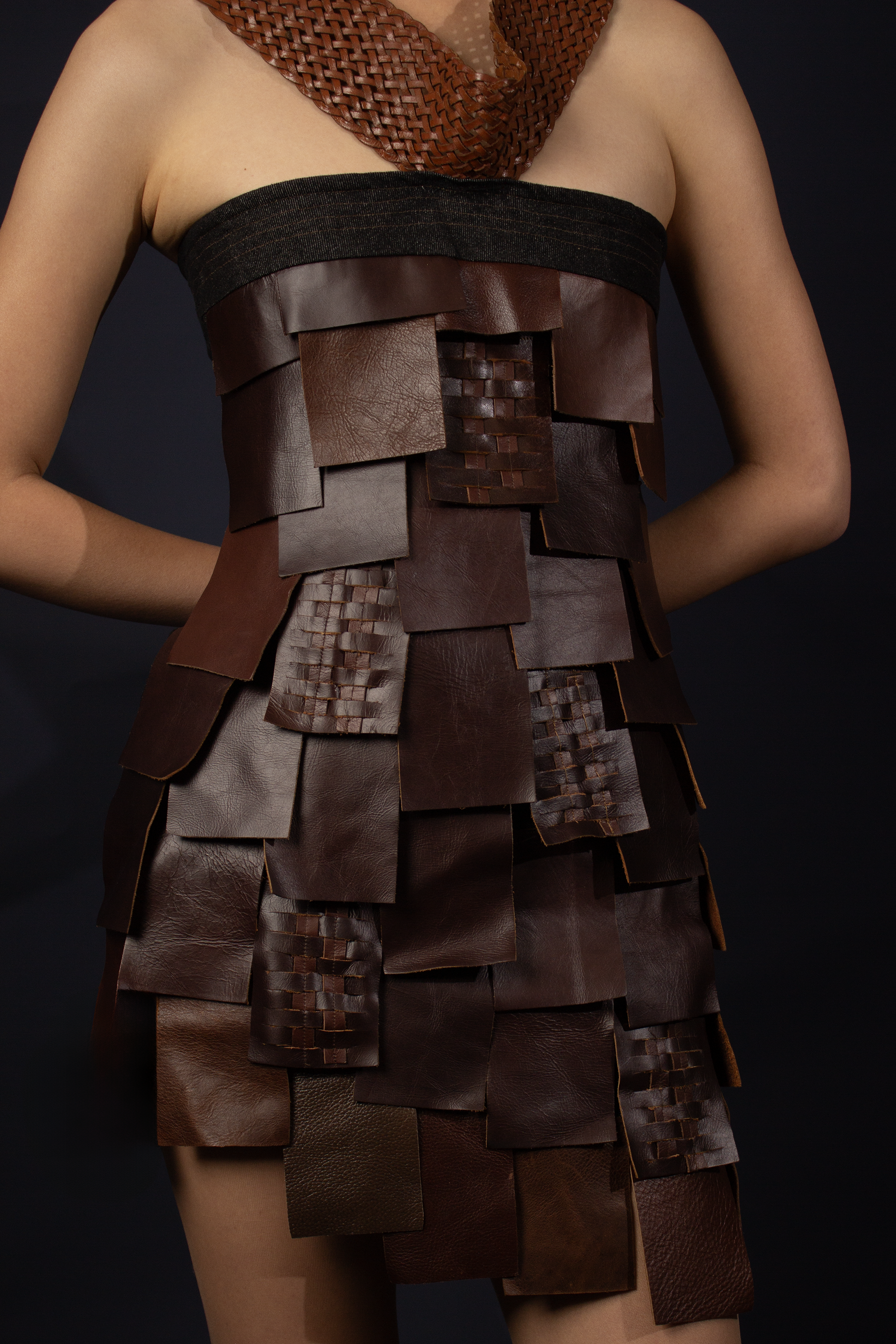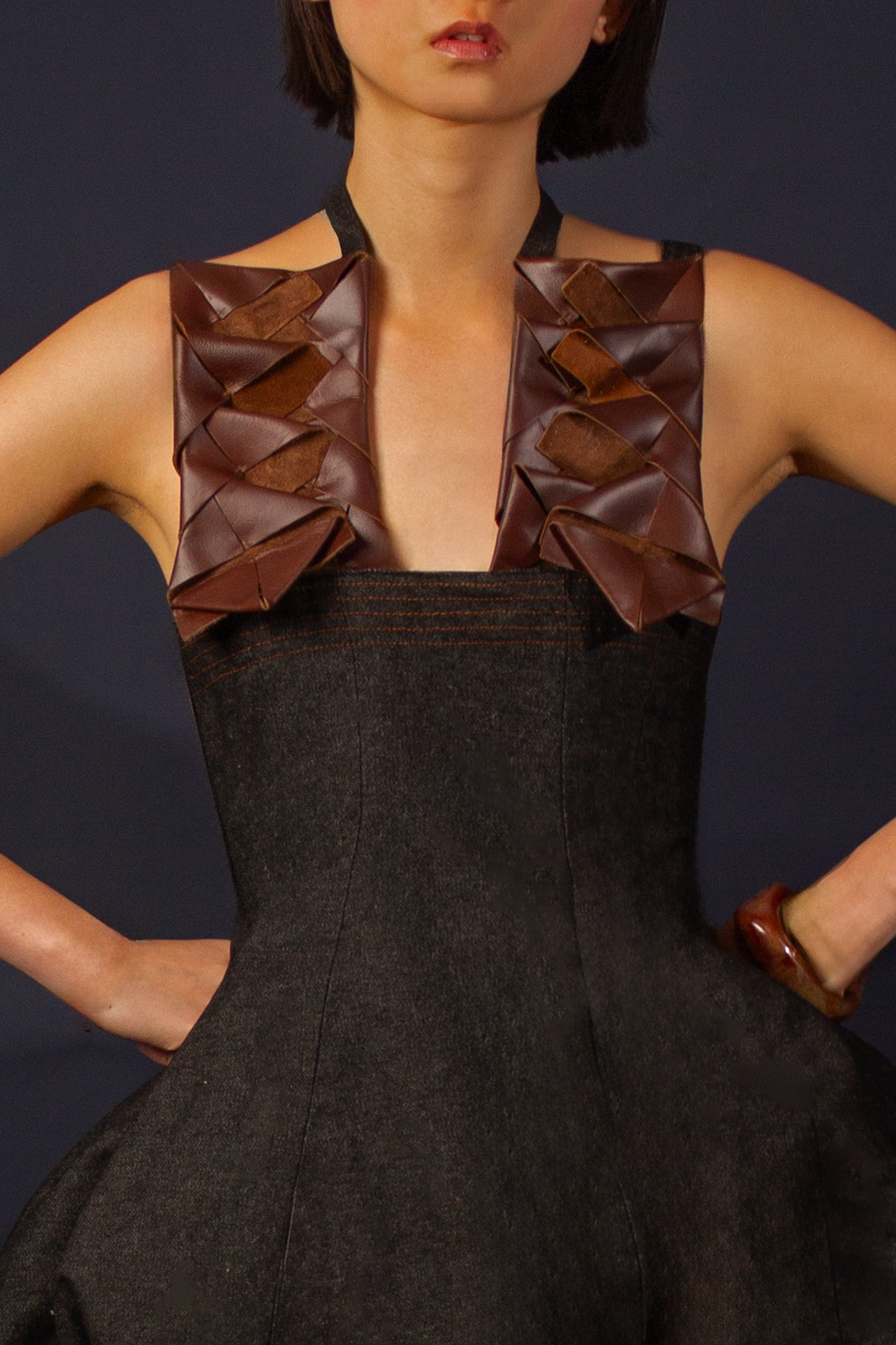 Oscillate is a collection that celebrates the movement of nature and the pull of nostalgia, inspired by a childhood spent in rural Tasmania. The designer uses texture and symbolism to craft a collection that is sleek and elegant, yet playful—inviting a closer look to uncover its thoughtful details. Influenced by vintage Western motifs, garlic and lantern flowers, artisanal leatherwork, and upcycling practices, each piece in Oscillate is designed to be treasured like an heirloom—something to keep, cherish, and pass down. Heirlooms and symbols hold the power to connect us to family and memory, especially when physical distance creates emotional space. Chloe’s collection reflects the complex feeling of nostalgia for a hometown you once longed to leave only to later find yourself drawn to the quiet charm and irreplaceable character of its people and places. Crafted from upcycled interior leather, denim, wool suiting, and corduroy, the garments are made to endure suited for both rural and urban landscapes. In a palette of rich browns, charcoal, and brass, Oscillate highlights texture and silhouette to create a visually striking, forward-thinking collection.