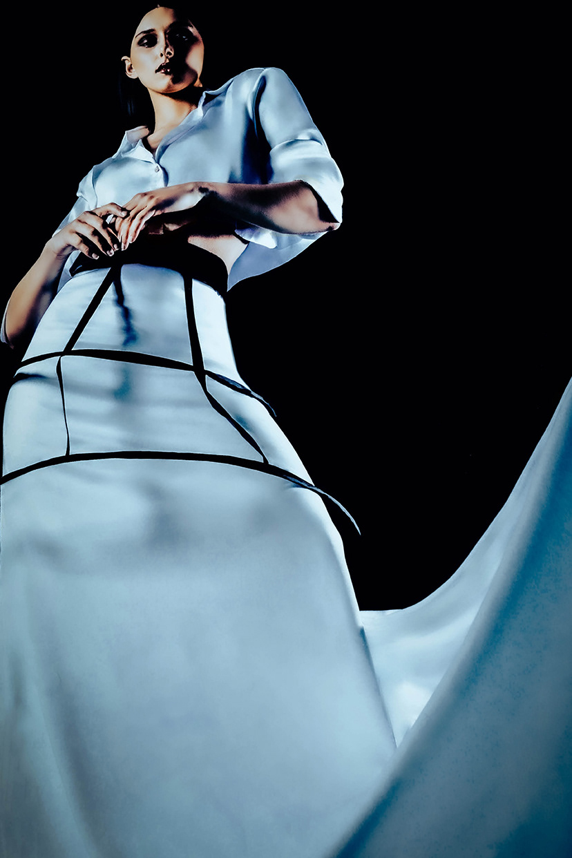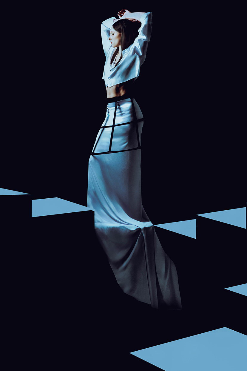 In the editorial concept for Echo, the idea of stepping away from reality and embracing moments of stillness is explored as a transformative element that shapes personal growth. The imagery reveals the complex duality of solidarity, showcasing how it can foster deep introspection while altering perceptions of the outside world. This narrative reflects the contemporary struggle with genuine human connection and emphasises solitude’s potential not as a void but as a space for revaluating self-identity and sparking personal growth. Through the use of sharp contrasts in colour, strategic lighting, and architectural compositions, the visual imagery symbolises separation from external influences. The use of props and structured silhouettes evokes a sculptural, almost meditative feel, heightening the sense of a person enveloped by their environment yet detached from it. These techniques invite the audience to not only see solitude as a state of absence but as an opportunity for profound realisation and connection with oneself. In this way, Echo celebrates the layered experience of solitude and its role in enriching our understanding of who we are.