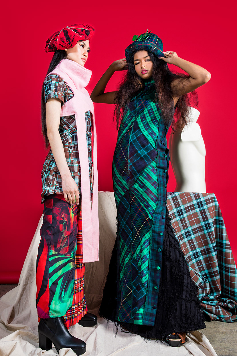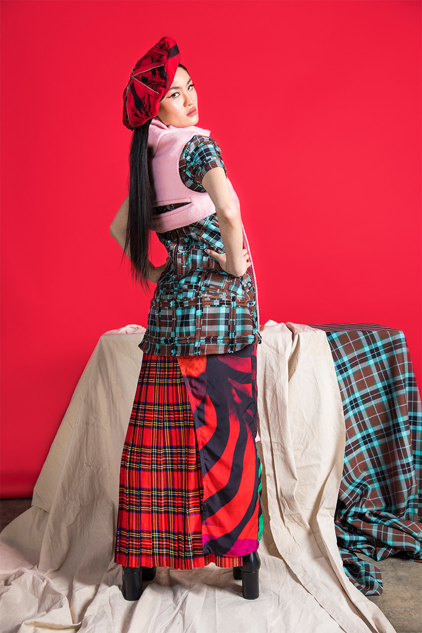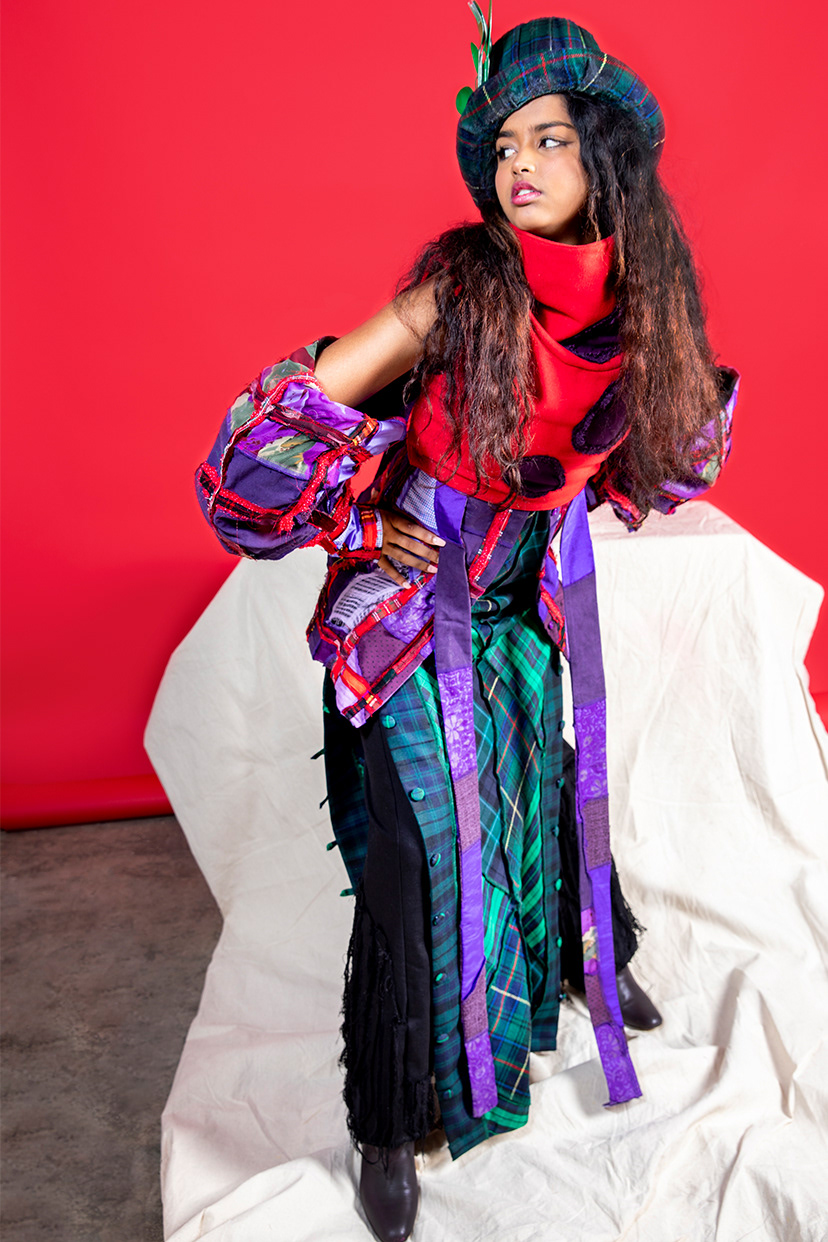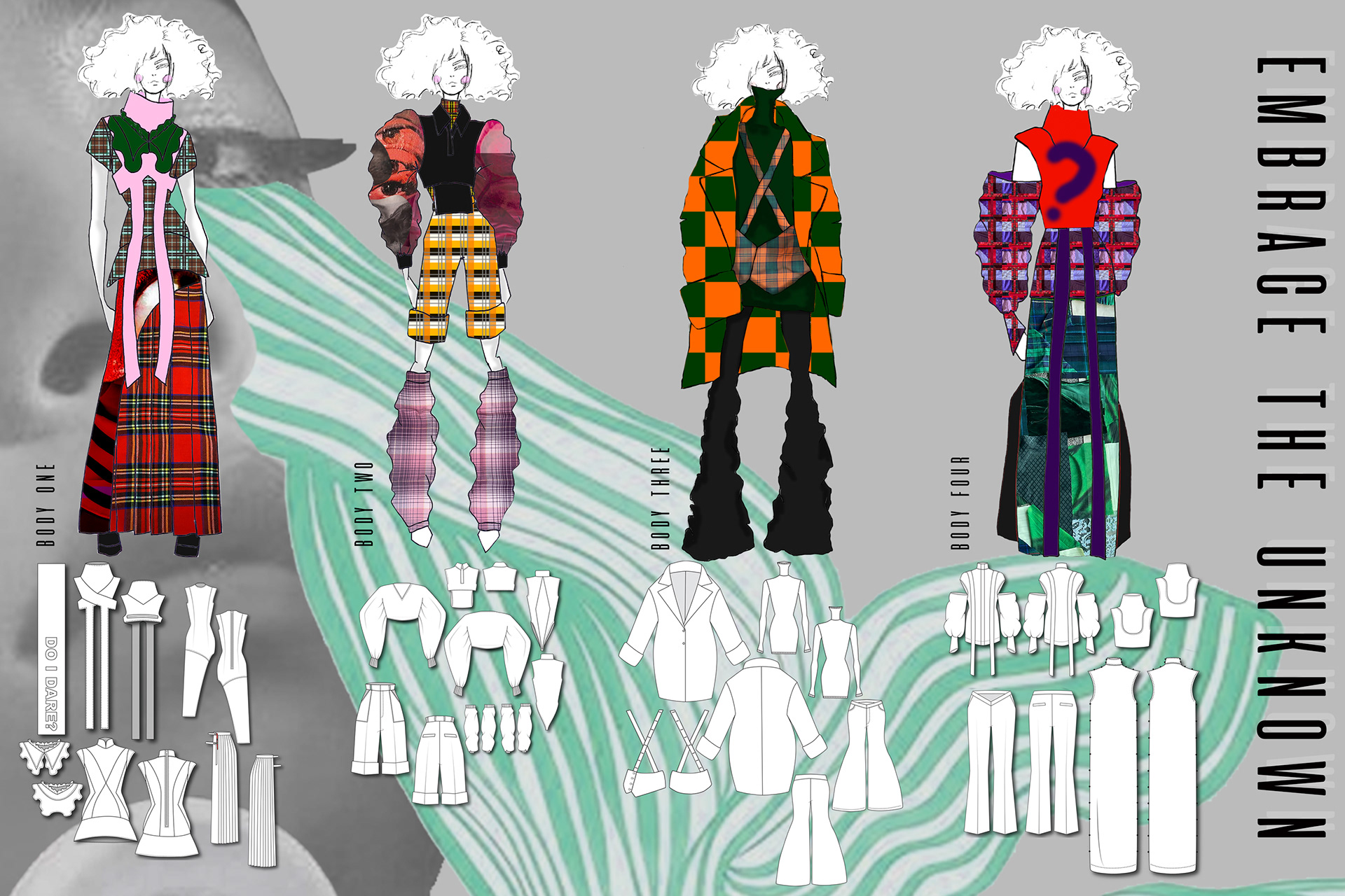 Ella's ‘Embrace the Unknown’ collection aims to capture the emotion of fear and instead empower the wearer to find beauty in the unknown. Each piece is intended to be an armour of protection to shield the wearer and this is expressed through sharp tailoring, tartan textures, repurposed clothing and loud prints.