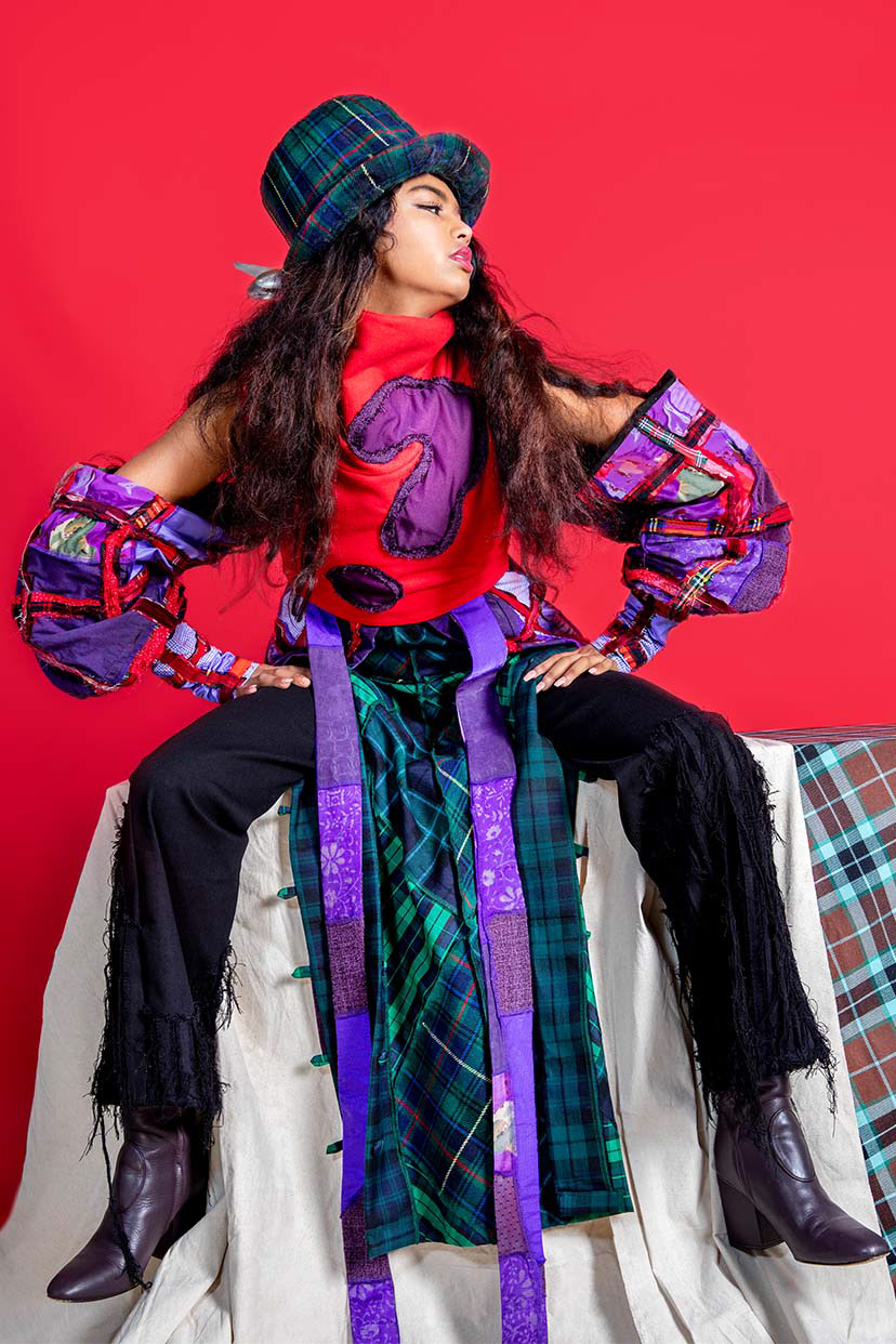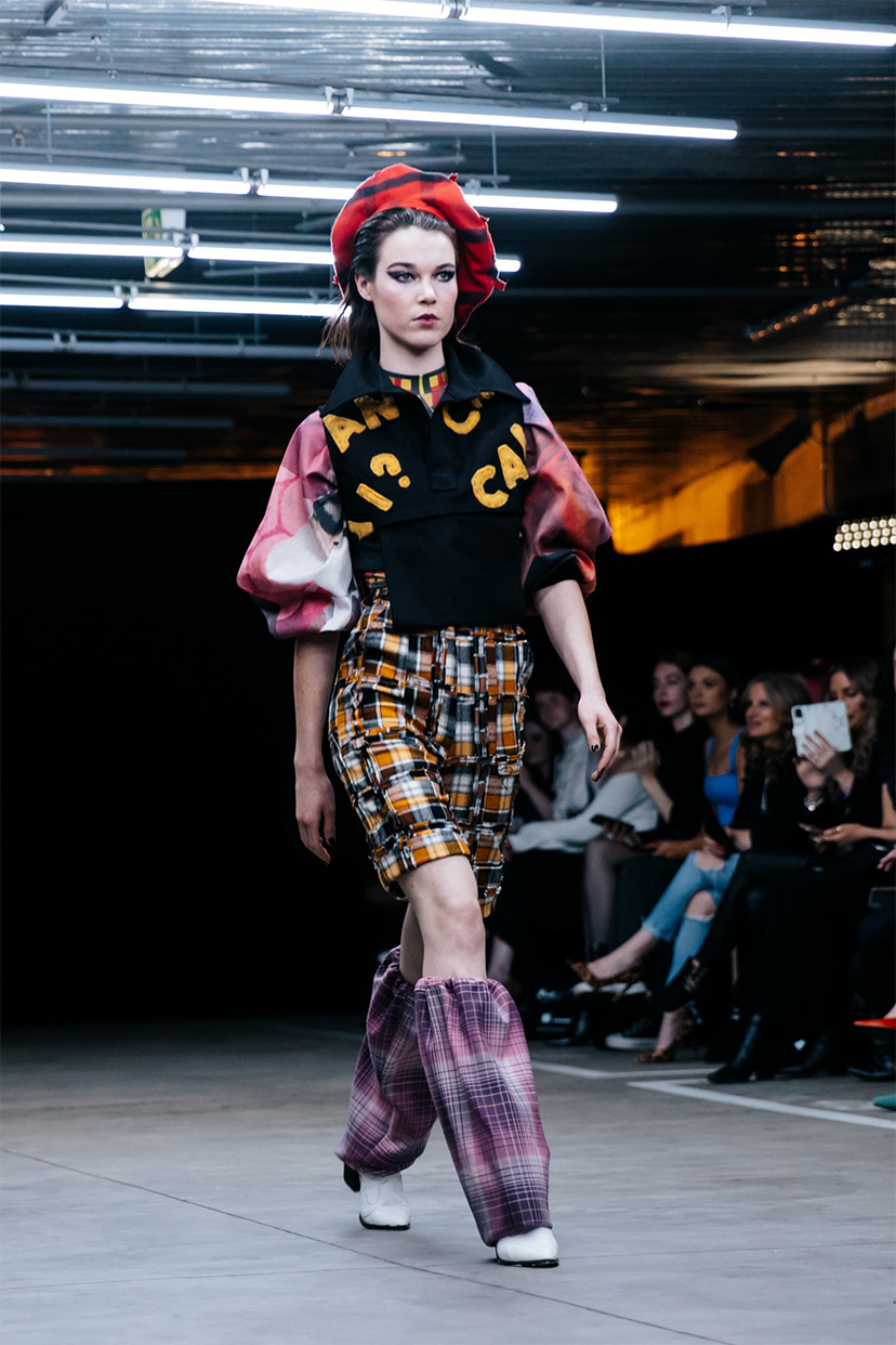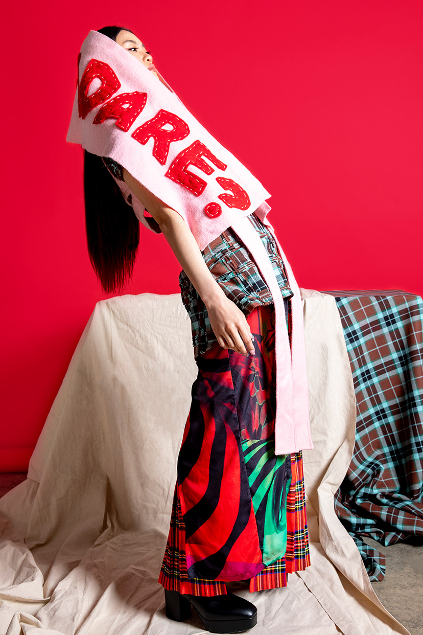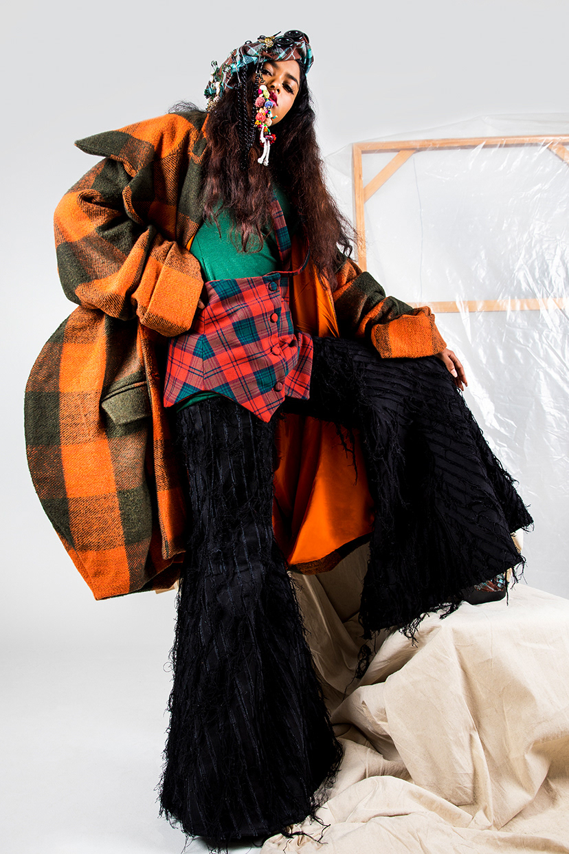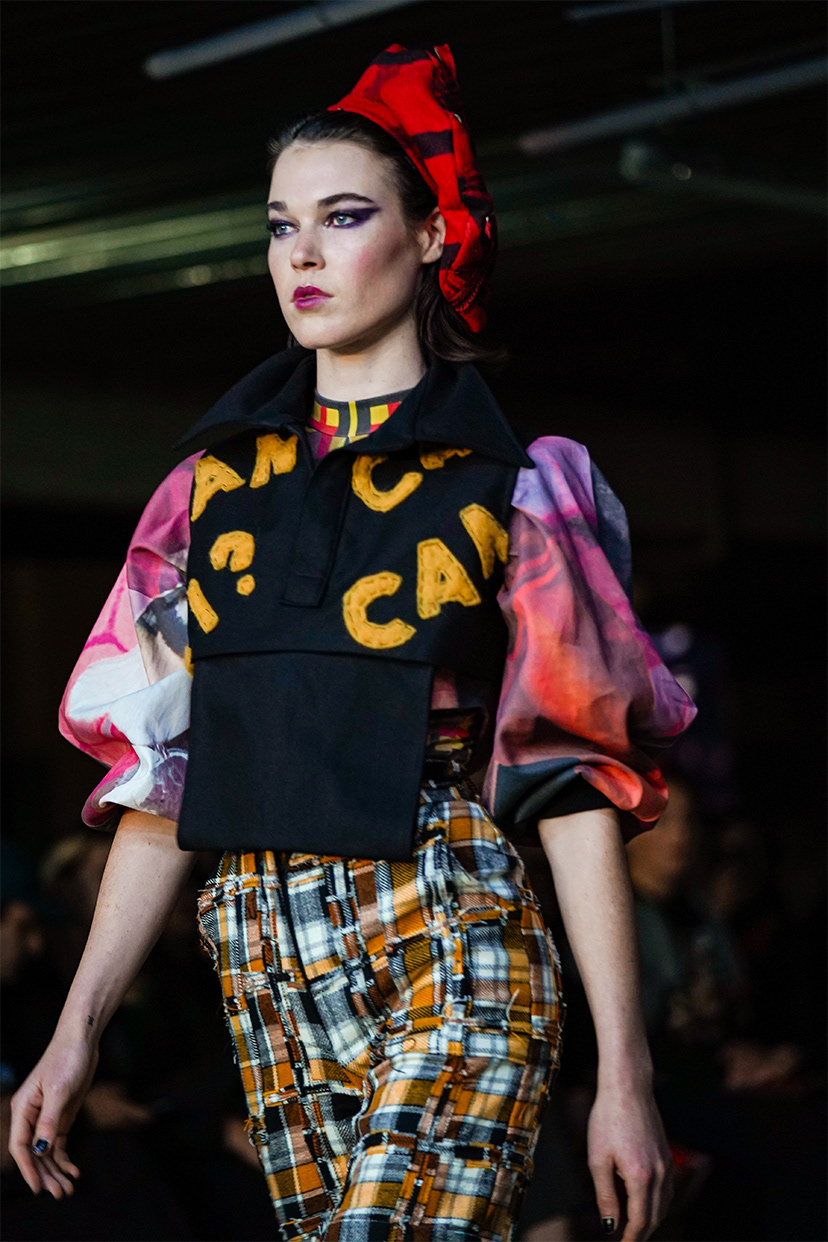 Ella's ‘Embrace the Unknown’ collection aims to capture the emotion of fear and instead empower the wearer to find beauty in the unknown. Each piece is intended to be an armour of protection to shield the wearer and this is expressed through sharp tailoring, tartan textures, repurposed clothing and loud prints.