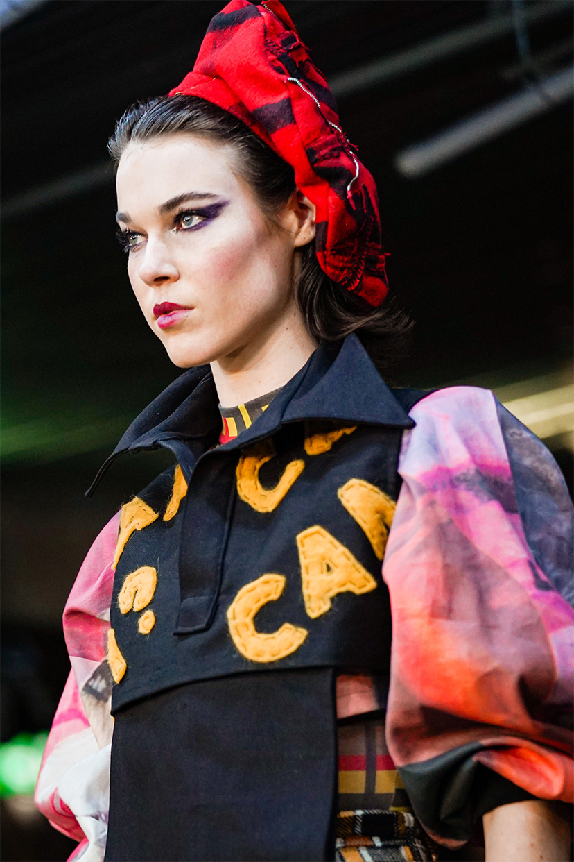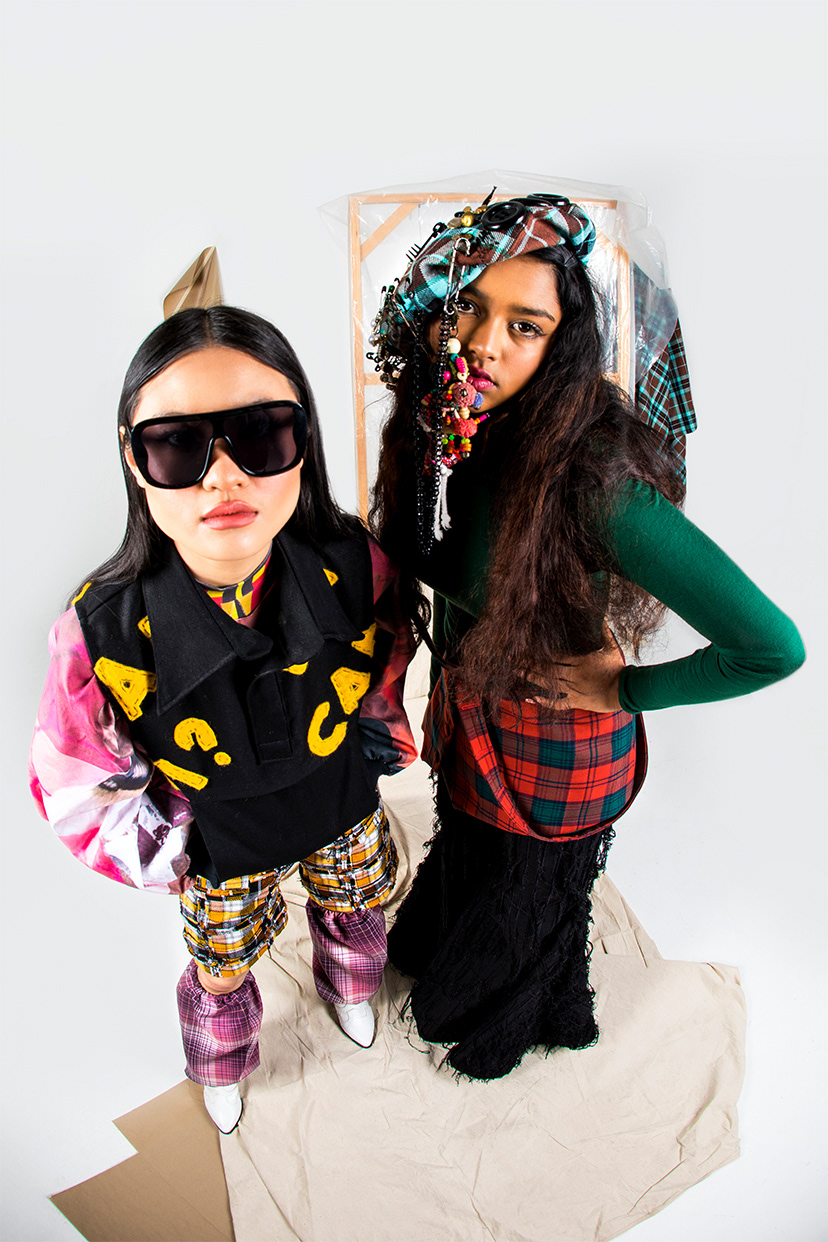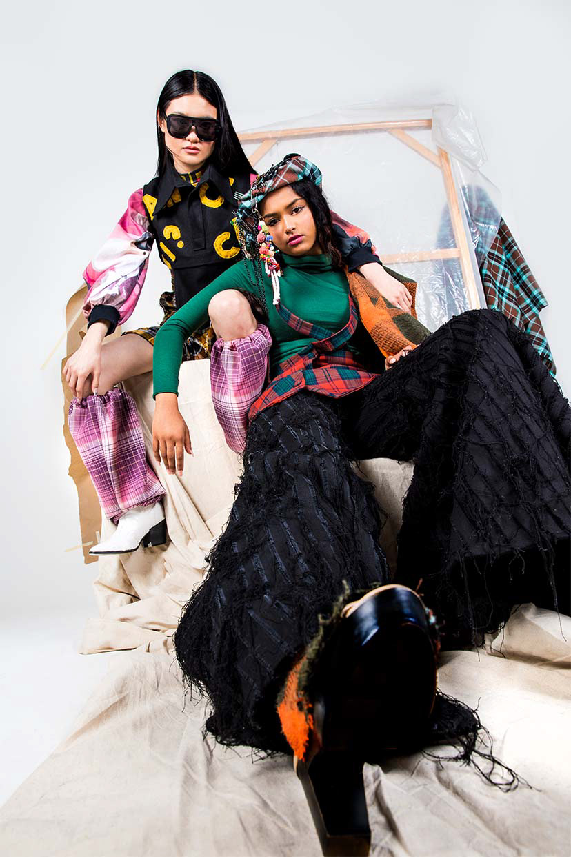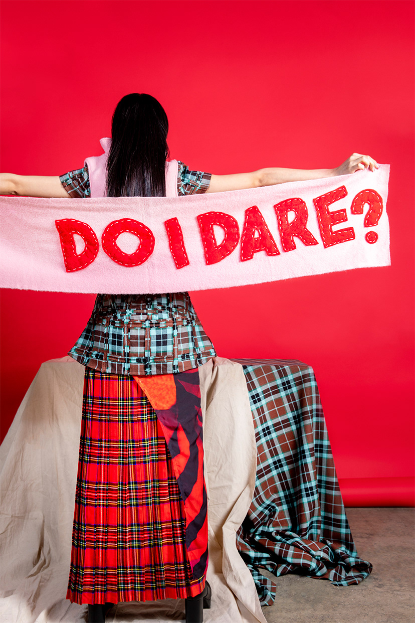 Ella's ‘Embrace the Unknown’ collection aims to capture the emotion of fear and instead empower the wearer to find beauty in the unknown. Each piece is intended to be an armour of protection to shield the wearer and this is expressed through sharp tailoring, tartan textures, repurposed clothing and loud prints.