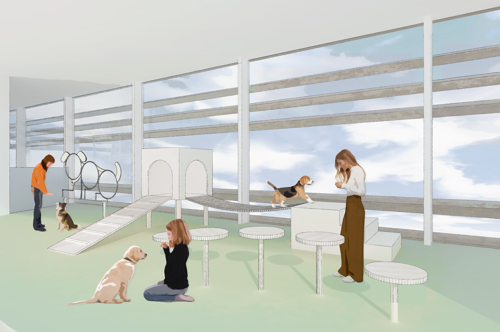 'Pause + Play' is an Animal Assisted Therapy Centre specialising in mental health therapy. The space is essentially where people can immerse themselves into play therapy assisted by trained therapy dogs. Designed for anyone and everyone, the space is where children, teenagers and adults who struggle with stress, social withdrawal, mental illnesses or disabilities are able to receive therapy. The concept of 'Pause + Play' can be defined as momentarily taking a break and engaging in fun and play as a way to improve mental health and wellbeing.