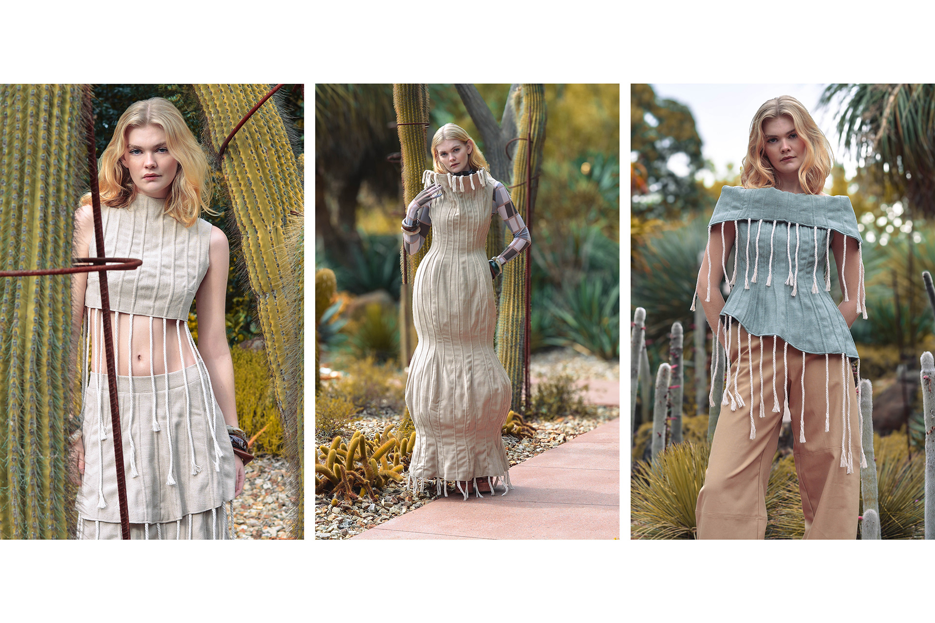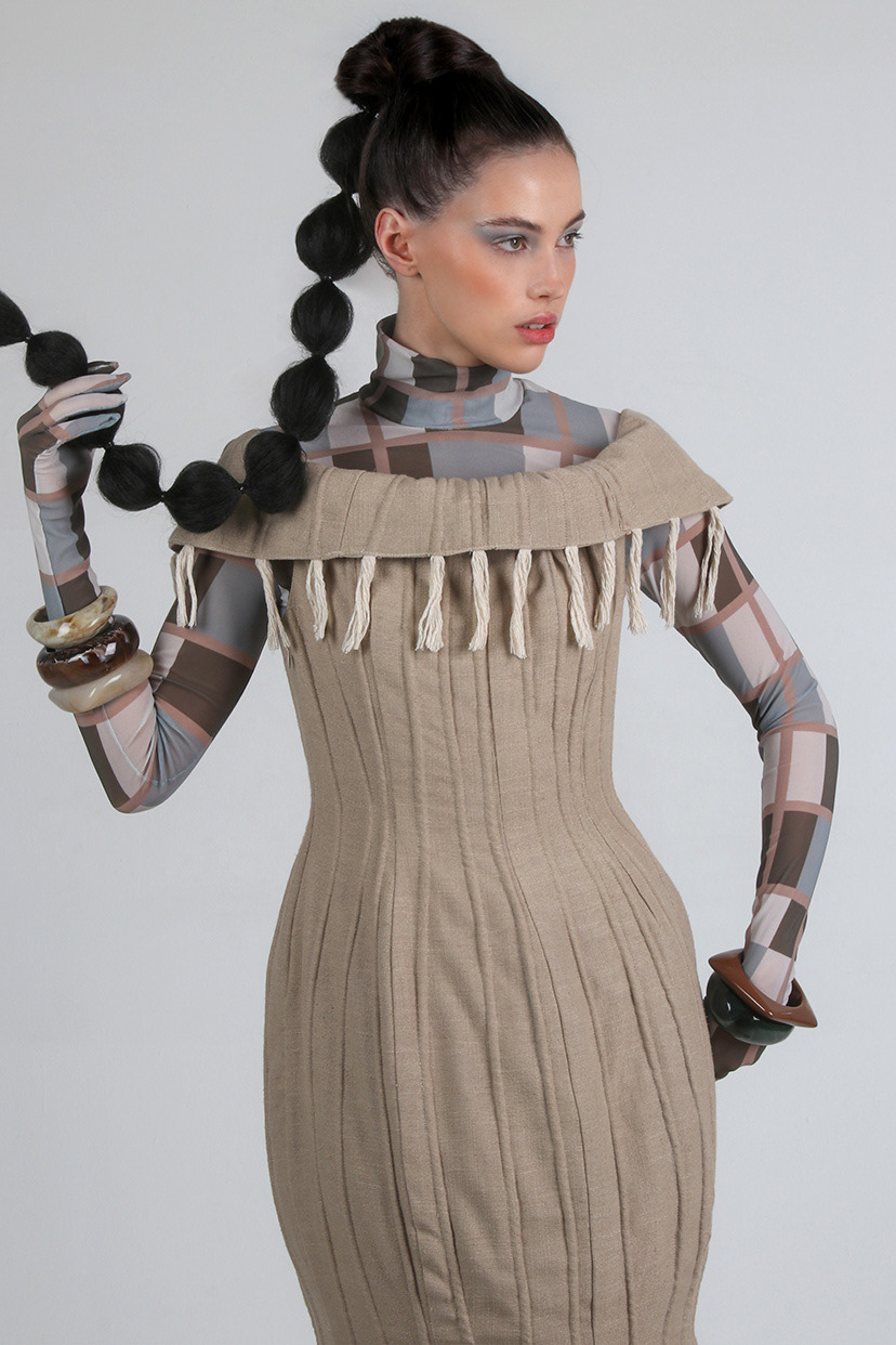 Solace reimagines clothing as sanctuary, forming a tactile boundary between the self and an uncertain world. Designed as resortwear, the collection balances sculptural layers with fluidity and ease.