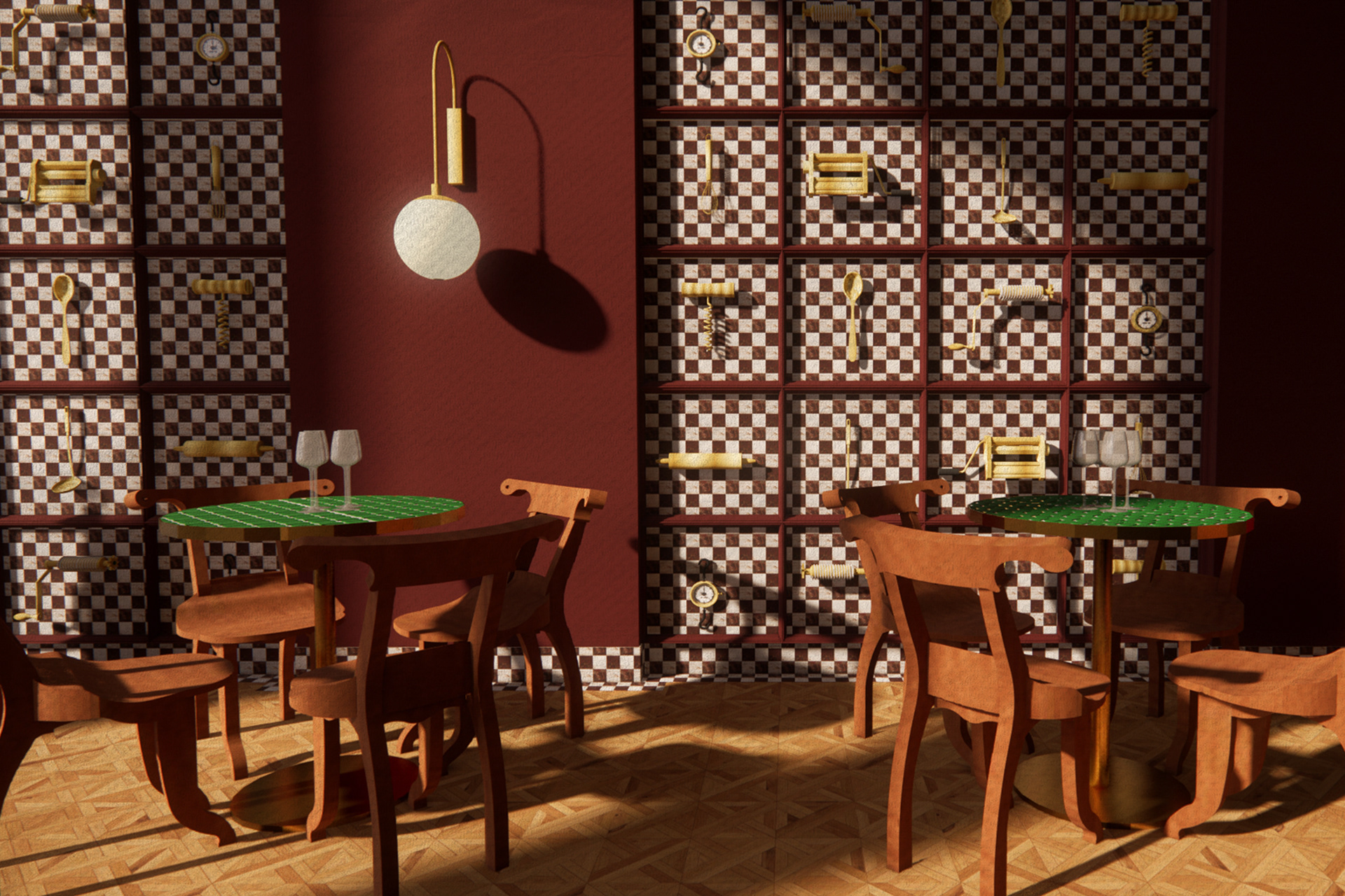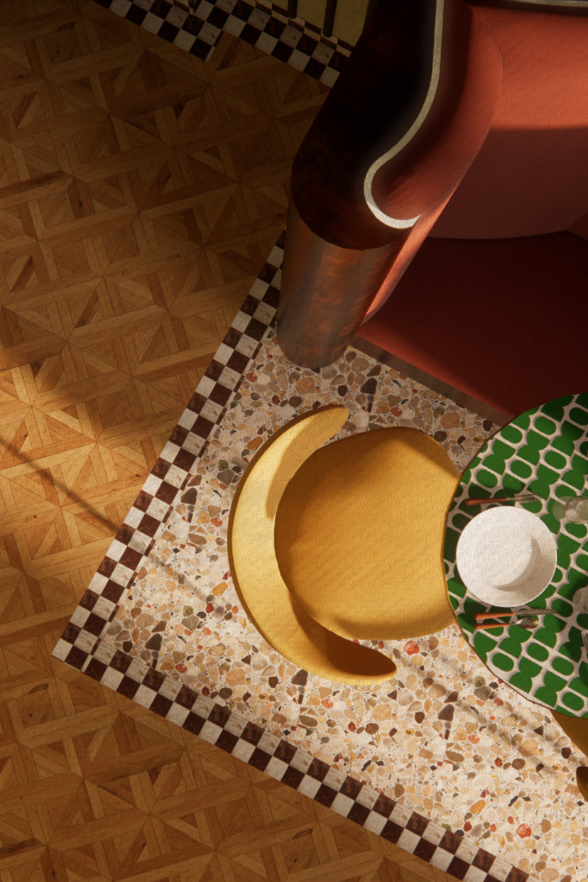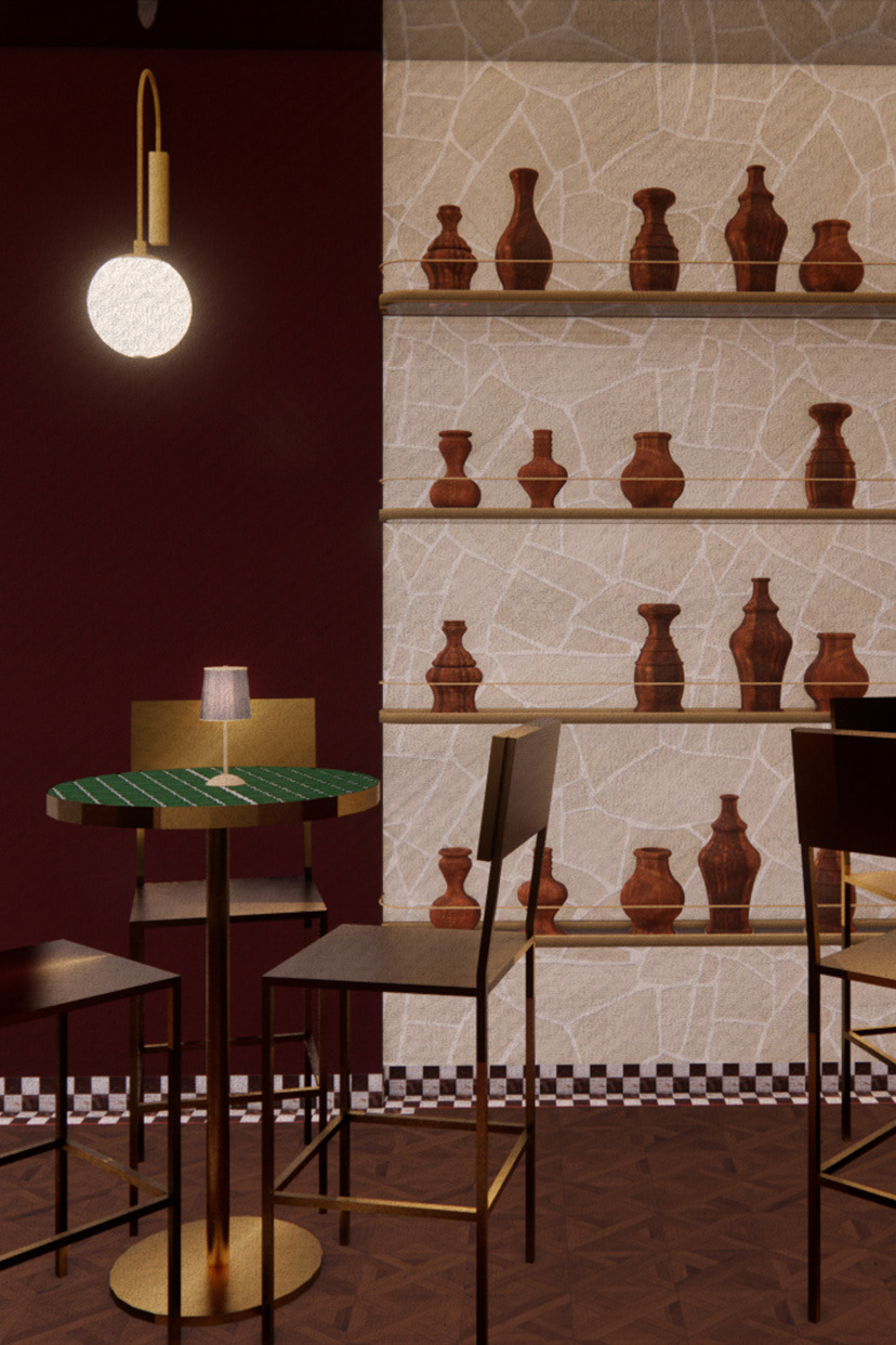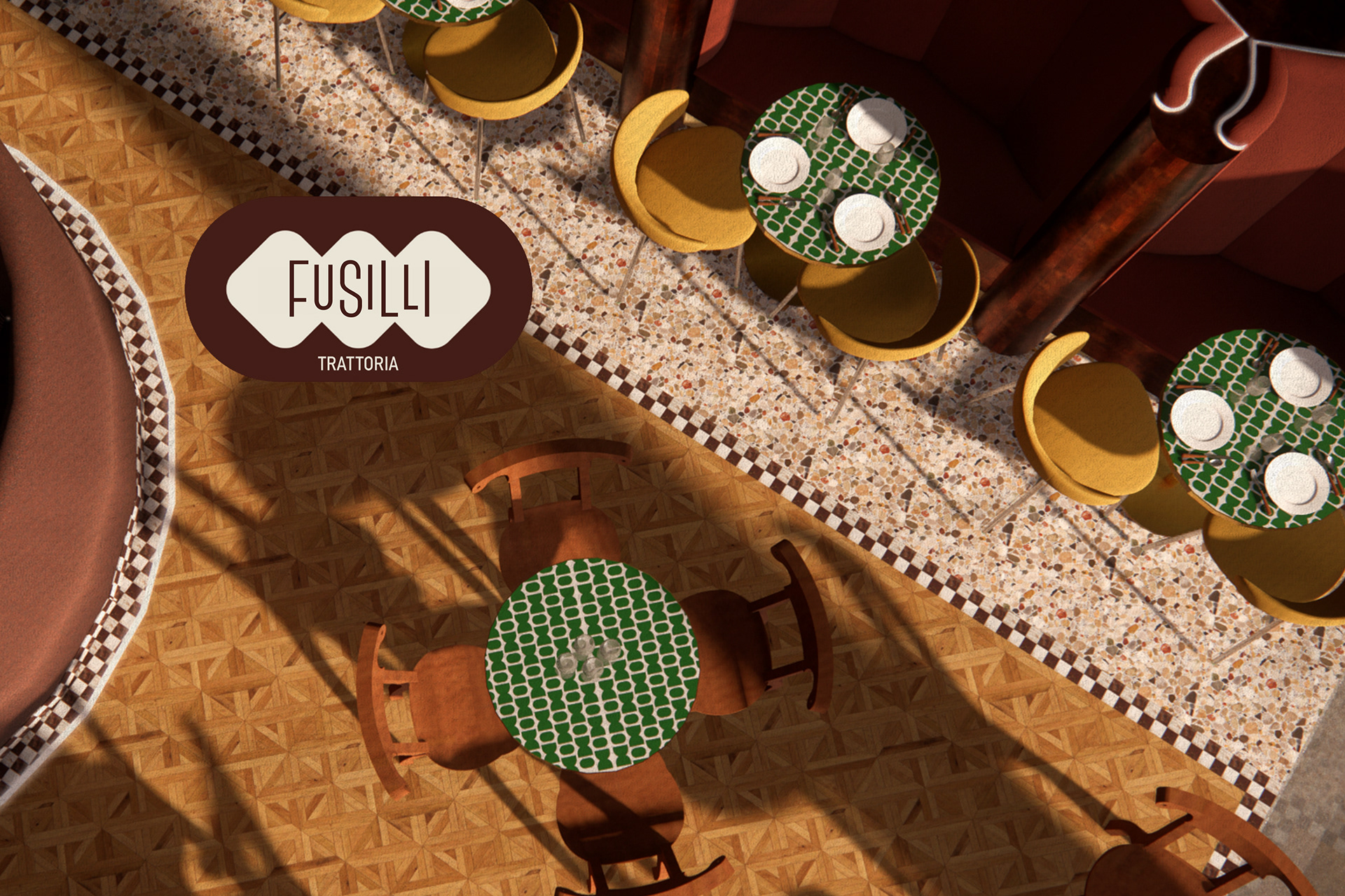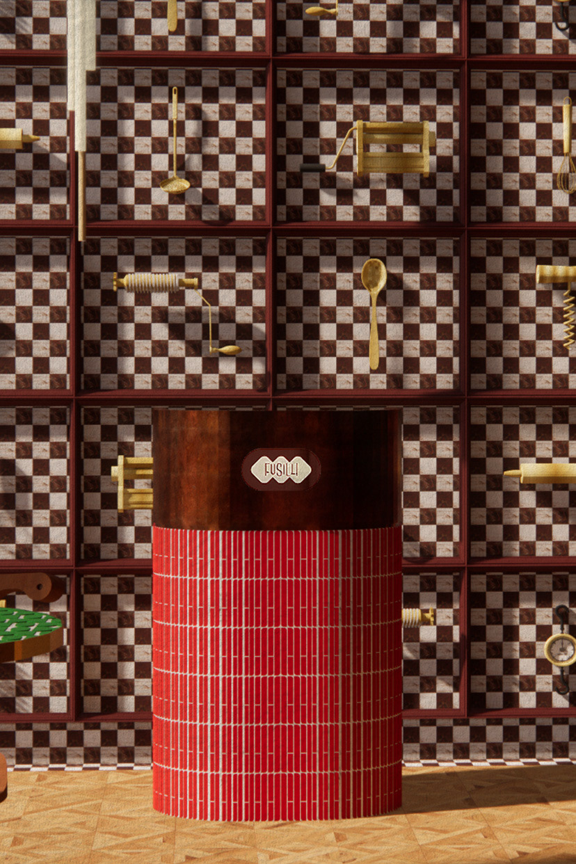 Fusilli is an Italian-inspired restaurant and bar that captivates guests with a rich fusion of nostalgic experiences, bold material contrasts, and a strikingly unique sculptural interior design. Rooted in childhood memories of vibrant and lively kitchens where the sounds of conversations, bubbling pots, and clinking cutlery, were strongly present. Enabled to create an intimate and passionate atmosphere, that aims to transform the restaurant and bar’s rich and immersive ambiance through personal experiences similar to Silvia Colloca’s family connections, warm materiality of medium to dark-toned timbers, handcrafted textiles, and colourful tiles to evoke a sense of comfort. Combined with a contrast of opulence through contemporary and recognisable design forms, and authenticity seen through materiality such as recycled wood, aged metal and worn leather. Ultimately encouraged a design proposal that feels both luxurious and genuine to Italian traditions.