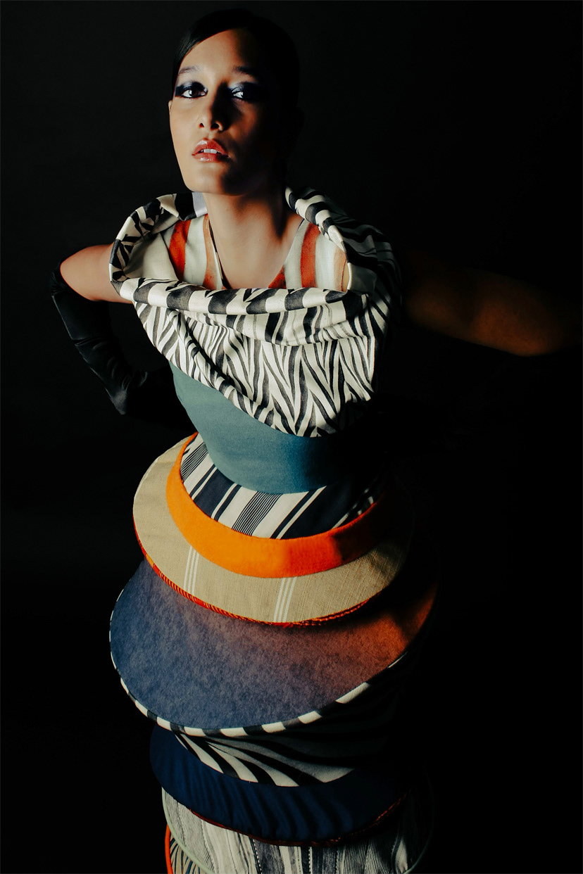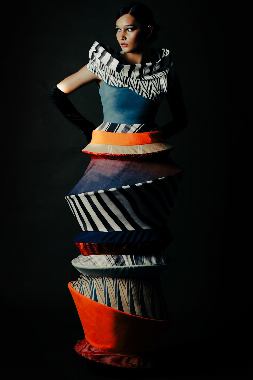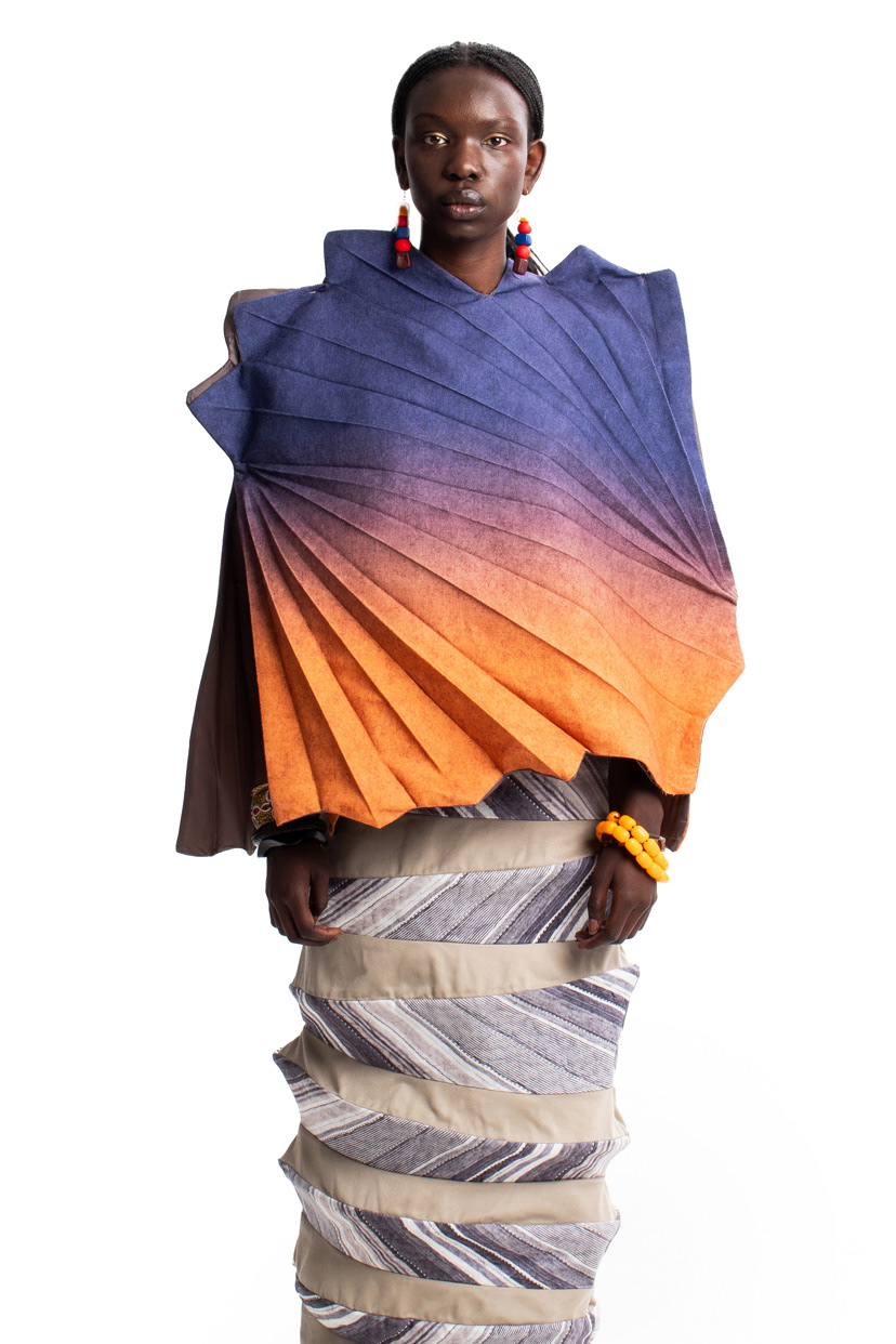 ‘Intertwine’ is a collection that takes inspiration from African artefacts and the ancient form art of origami – creating unexpected fusion between two history-rich cultures. The collection is made up of four pieces, three bodies, which is designed to reject the natural body as the ideal silhouette. A variety of prints, textiles and textures are incorporated and intertwined throughout these garments.