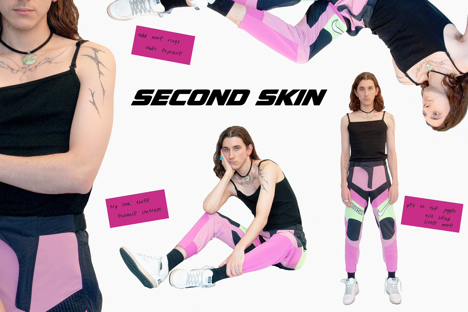 Emini’s signature project named “Second Skin” explores the idea of clothes and gender. It is a high-end visual memoir that shows Emini’s personal style, identity and how he perceives clothes. Exploring the idea of innerwear as outerwear and how layering can create full editorial looks. Emini also plays with the idea of fragile masculinity and how toxic it is for a male growing up, delving into these themes through the styling and sourcing of garments. Six core looks have been formed through Emini’s exploration of a historical and current trend fetishized fashion, that all share key elements of gender fluidity and erotic style.
