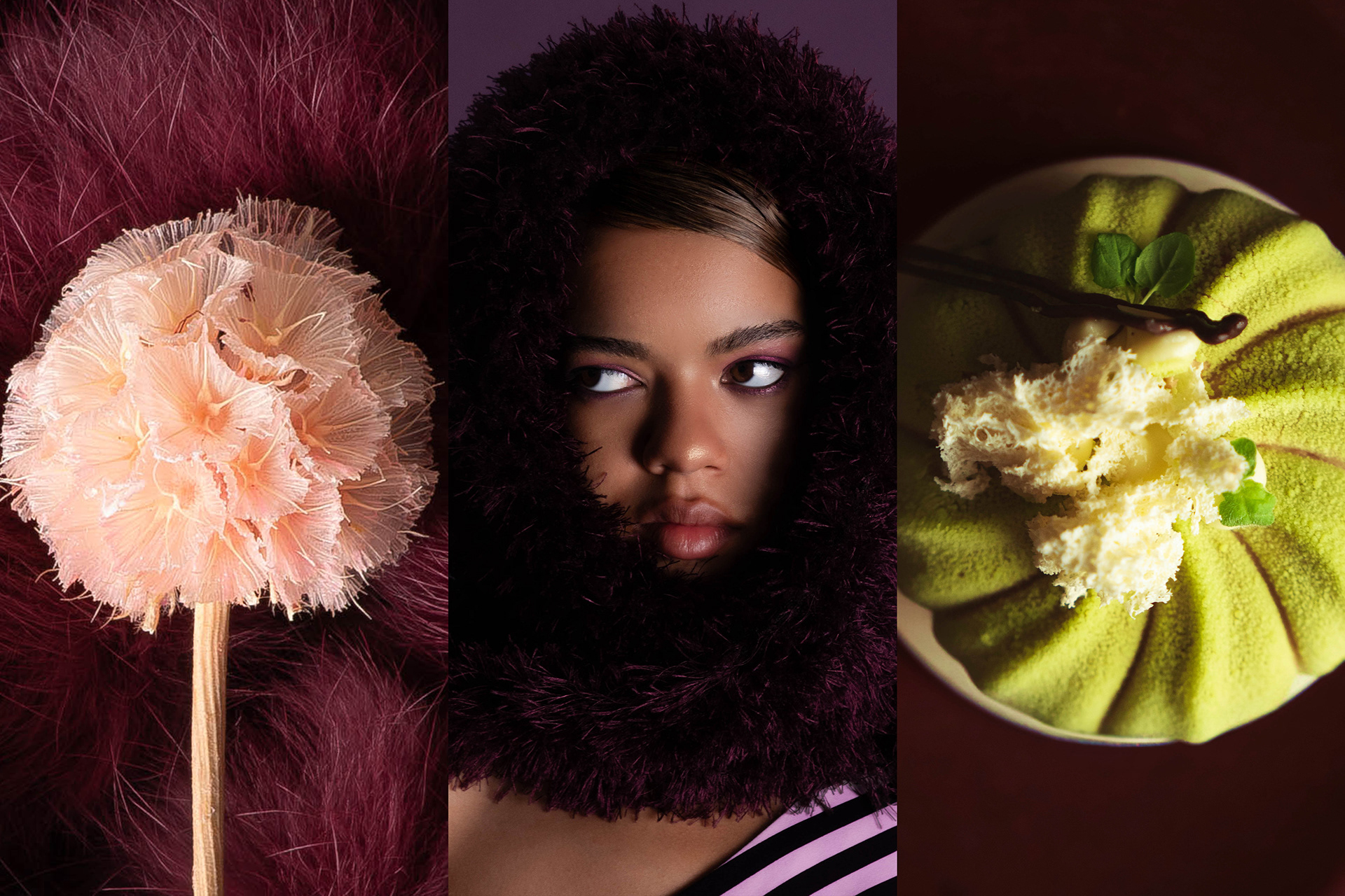 Obscura, is an atmospheric colour story that intertwines fashion, food, interiors and beauty into one surreal and immersive narrative. It tells a story of eclectic whimsy, where the familiar is made strange through surrealist details and vintage tactile elements. Rooted in deep burgundy, huckleberry and chartreuse to amplify the eerie and mysterious undertone. Embroidery acts as both a literal texture and a metaphor, marking memory and time whilst weaving the multiple elements into one visual experience. The editorial invites viewers to linger, allowing them to interpret whether they are encountering a physical space or wandering through a dream, uncovering a sense of beauty hidden in the details.